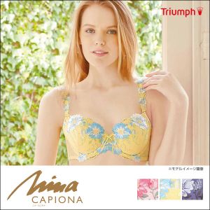 ニナ・カピオナの2015FWテーマ「Innocent Flowers」女性が潜在的に持つ無邪気な子供心を刺激する色鮮やかな花々。夢と現実の間の不思議な空間、どこか懐かしいロマンティックな物語を表現。満開のスノーランドの花が華やかなニナ カピオナ263 3/4カップブラジャー。カップは保形性と通気性に優れたエンジェルクッションライトを使用しているので、ソフトで軽い着け心地でありながら、綺麗なバストラインをメイクします。立体3枚接ぎのカップ裏には取り外しできるパッドと、脇をスッキリさせてくれるサイドコンシャス入り。フロント中心のワイヤーを外側に反らせた「NEWエンジェルワイヤー」を採用しているので、肌に食い込みにくく、軽い着け心地。ストラップのとめ具には三角形の特殊な形をしたデルタマジック※を使用しているので、肩からずれ落ちにくくなっています。ストラップは取り外し可能。※トリンプ独自の研究とテストを重ねて生まれた、ブラジャーのカップとストラップをつなぐ小さな三角形。